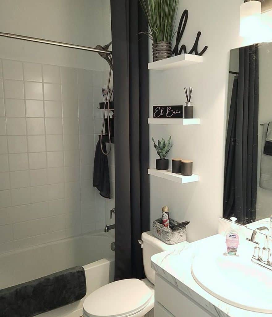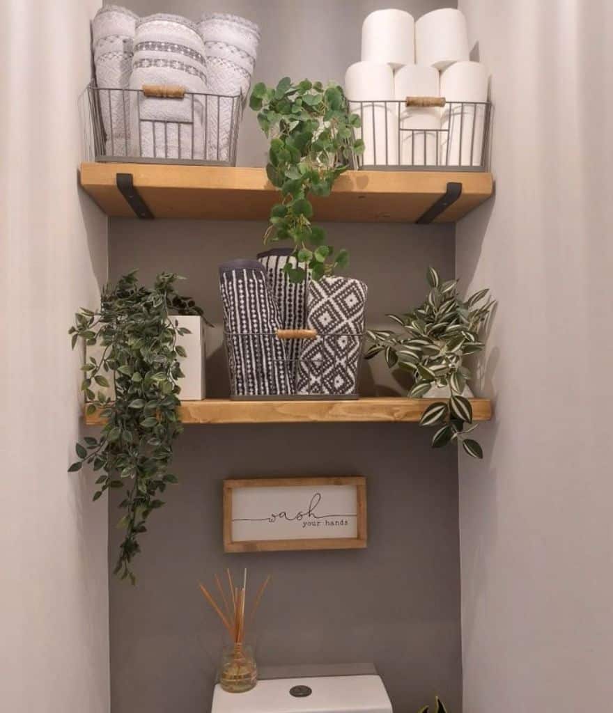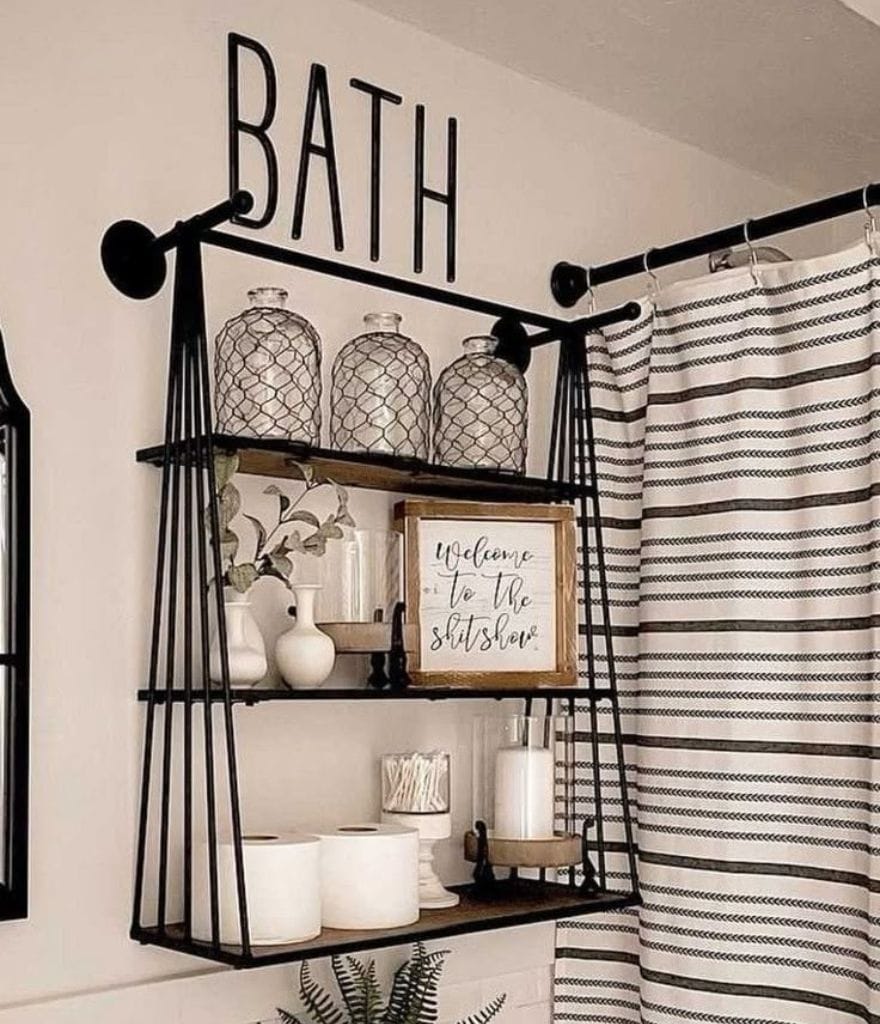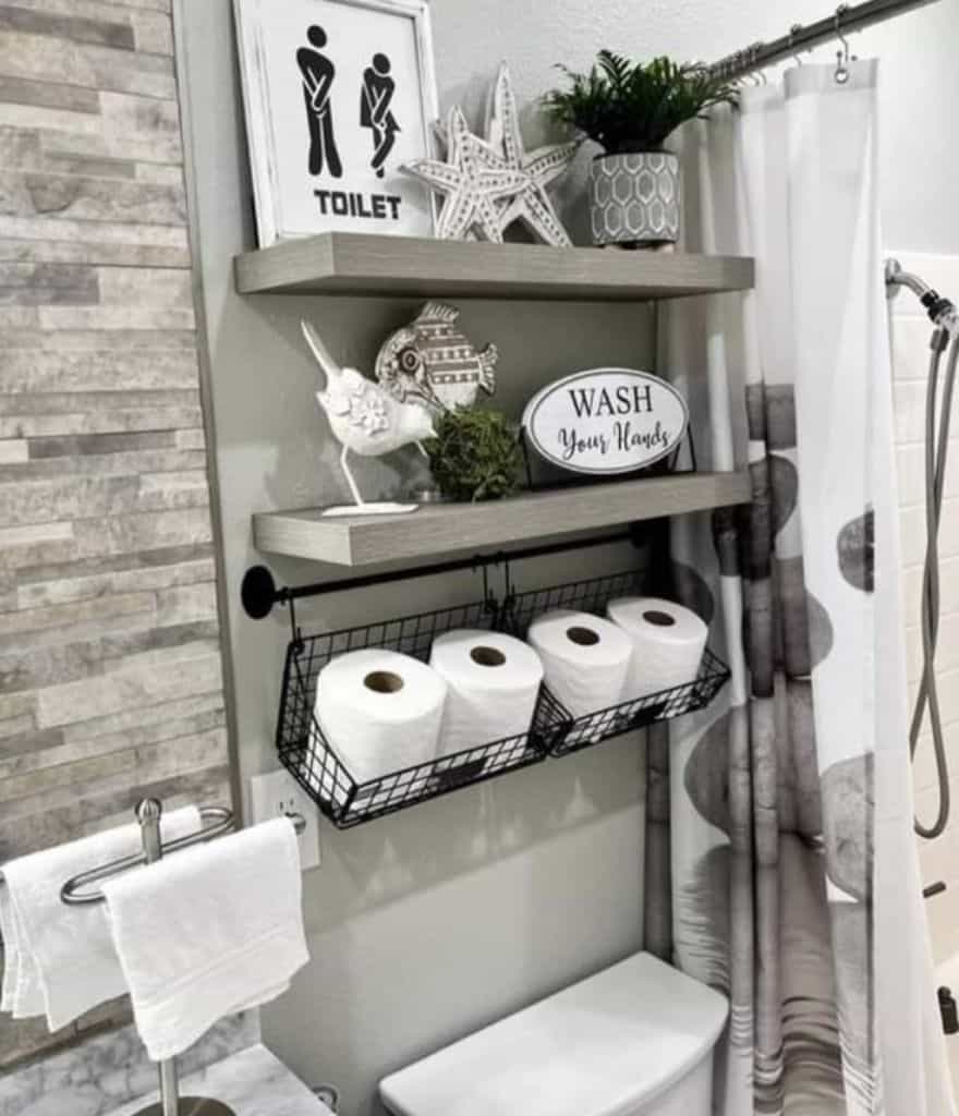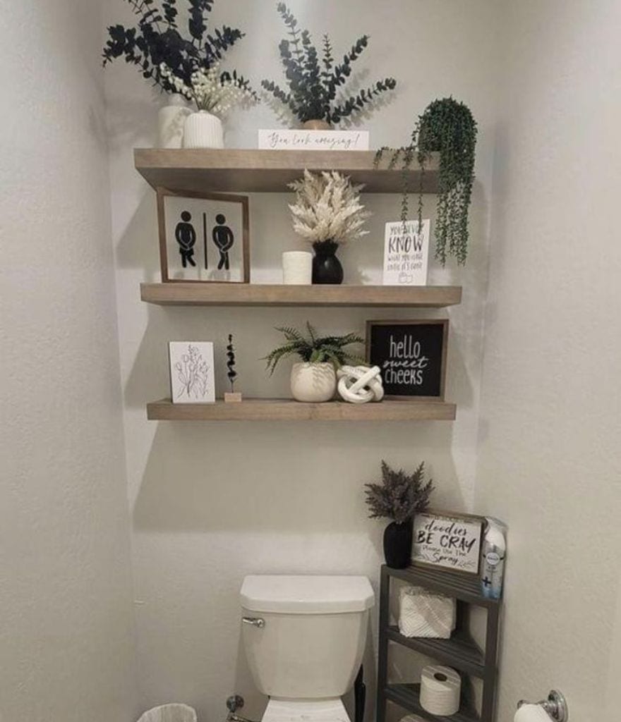 If you’re going for a black and white aesthetic, then this setup will inspire you. Black floating shelves hold decorative accents and practical items, while a wire shelf below keeps extra toilet paper easy to reach.