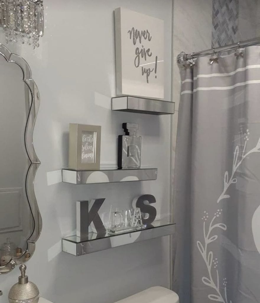 This over-the-toilet decor idea brings a touch of glamour and shine to the bathroom with mirrored floating shelves and sparkling silver accents.