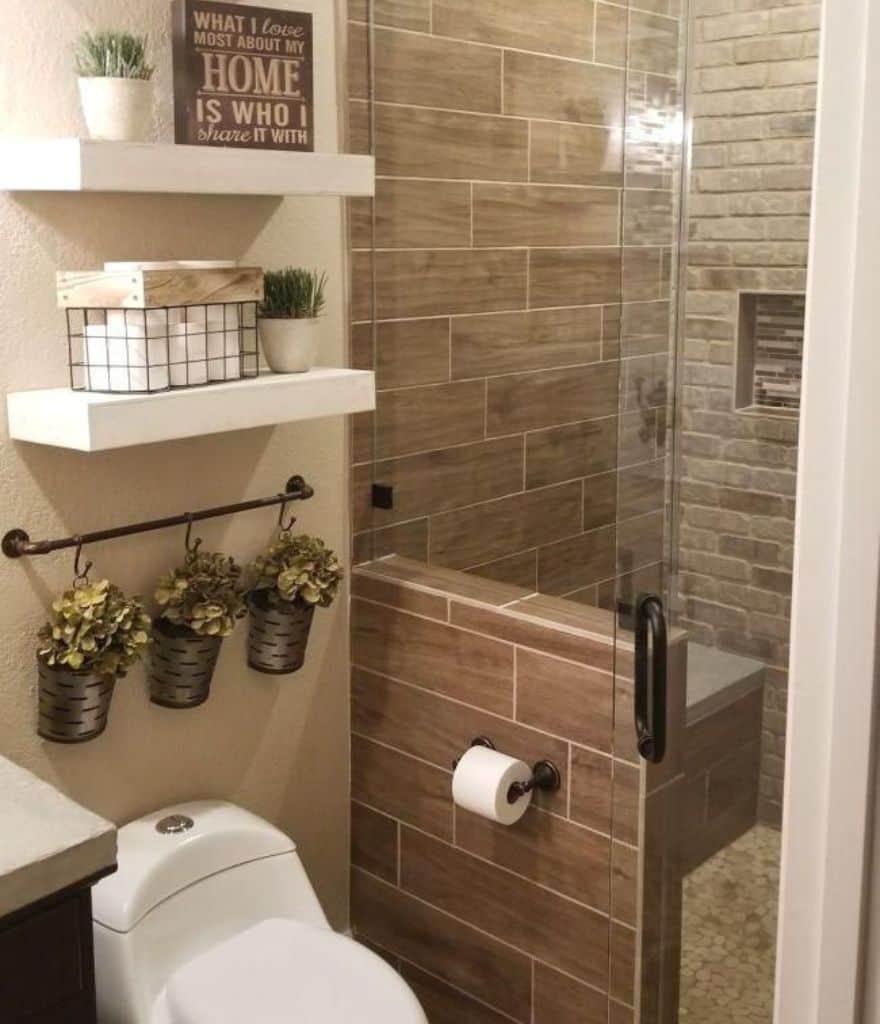 The look combines functionality and warmth, perfect for compact bathrooms that need storage and a homey feel.