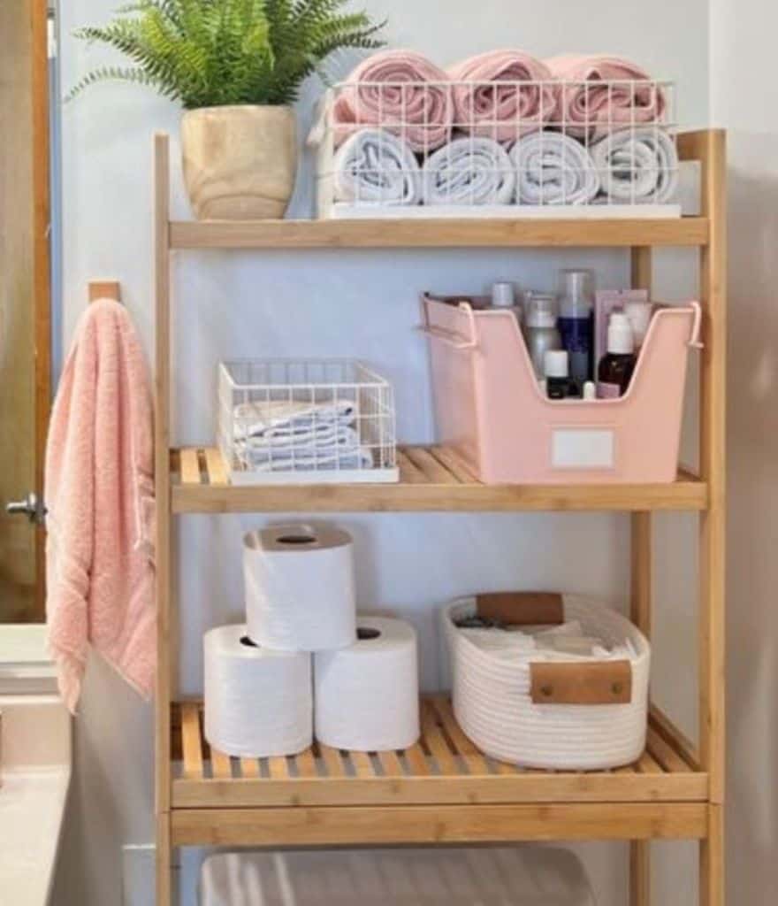 This over-the-toilet storage solution uses a natural bamboo shelving unit to keep bathroom essentials tidy and stylish.