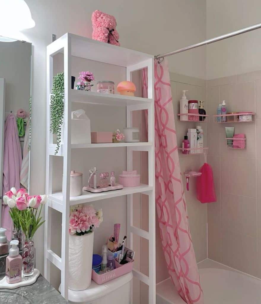 Decorate each white shelf with pink bins, floral accents, candles, and beauty essentials, all coordinated for a fresh and cheerful look.
