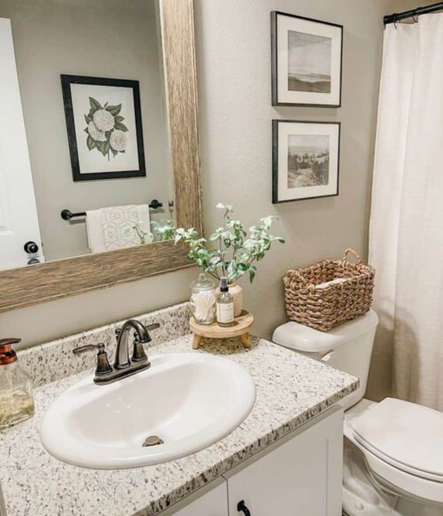 Framed botanical and landscape art above the toilet makes the wall feel styled and inviting.