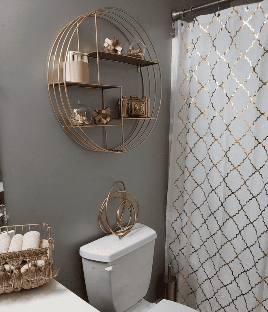 This over-the-toilet decor setup brings a chic, glamorous touch to the bathroom with bold gold accents.
